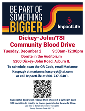 Dickey-John/TSI is hosting a Community Blood Drive from 9:30 am-Noon on Tuesday 12/2 at their cility in the Auditorium at 5200 Dickey-John Road in Auburn Appointments are requested. You may either call Marianne Kasprzyk at 217-438-3371 or ImpactLife at 800-747-5401 to schedule.