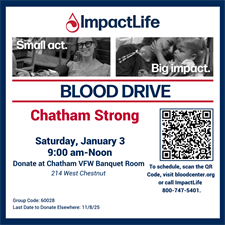 Chatham Strom Community Blood Drive at Chatham VFW Banquet Room at 214 West Chestnut in Chatham from 9am-Noon on Saturday 1/3. Appointments are requested. Please call ImpactLife to schedule.