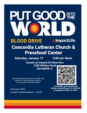 Concordia Lutheran Church & Preschool Center is hosting a Community Blood Drive in their parking lot at 2300 Wilshire Road on our ImpactLife Donor Bus on Saturday 1/17 from 9am-Noon. Appointments are requested. Please call either the church office at 217-529-3307 or ImpactLife at 800-747-5401 to schedule.