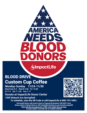 Springfield's owner operated Custom Cup Coffee is hosting the Quarterly Community Blood Drive Week Monday-Sunday 11/24-11/30 at our ImpactLife Springfield Donor Center-times will vary per day of the week-see attached flyer for times. Appointments are no longer required at our Donor Centers however, if you would like to schedule for a particular day/time slot, please call ImpactLife at 800-747-5401.