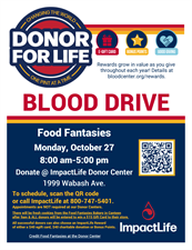 Springfield's Food Fantasies is hosting their Quarterly Community Blood Drive at our ImpactLife Springfield Donor Center at 1999 Wabash Ave on Monday, 10/27 from 8am-5pm. Appointments are NOT required however, if you would like to schedule an appointment for a particular time slot, please call ImpactLife at 800-747-5401.