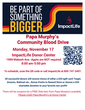 Springfields Papa Murphy's is hosting their Quarterly Community Blood Drive on Monday 11/17 from 8am-5pm at our ImpactLife Springfield Donor Center at 1999 Wabash Ave. Appointments are NOT required, however, if you would like to schedule for a particular time slot, please call ImpactLife at 800-747-5401.